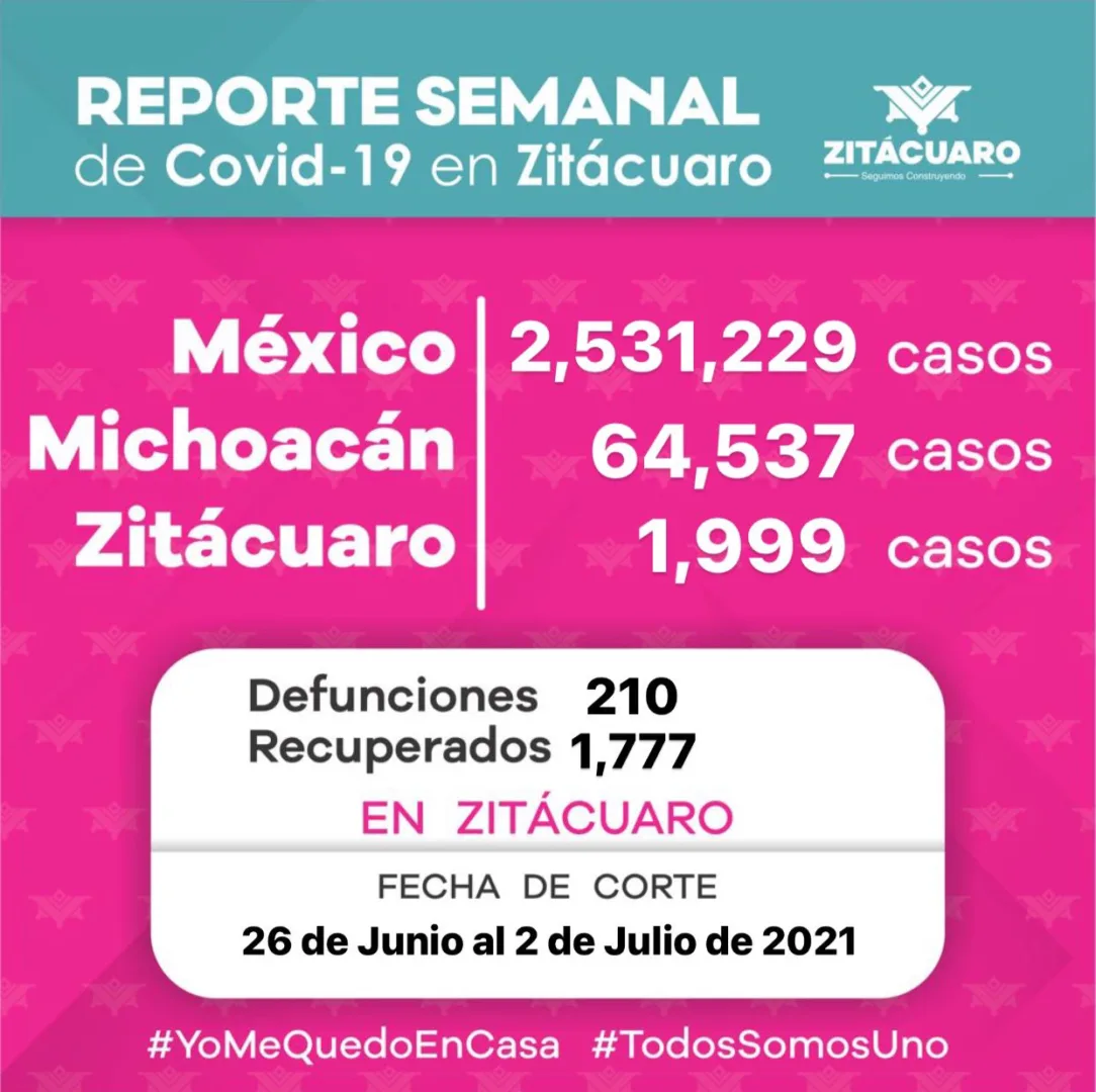 Presentamos la información recabada del 26 de junio al 2 de julio de 2021, la situación del COVID-19 en Zitácuaro es: