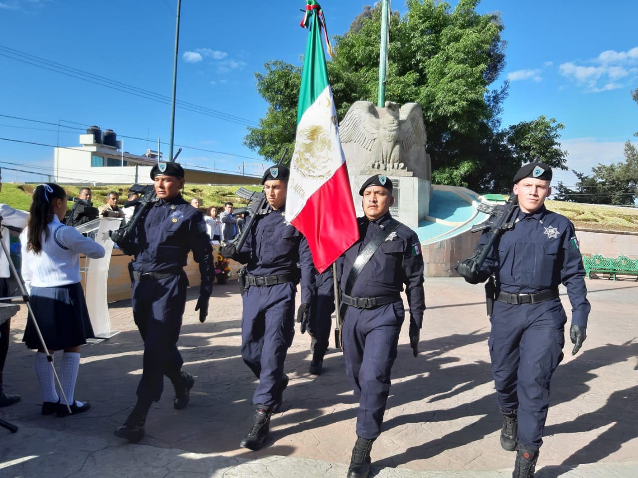 La Escolta y Banda de Guerra de la Secretaría de Seguridad Pública engalano el homenaje cívico, donde se rindieron honores al Lábaro Patrio.