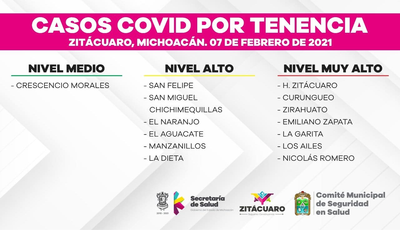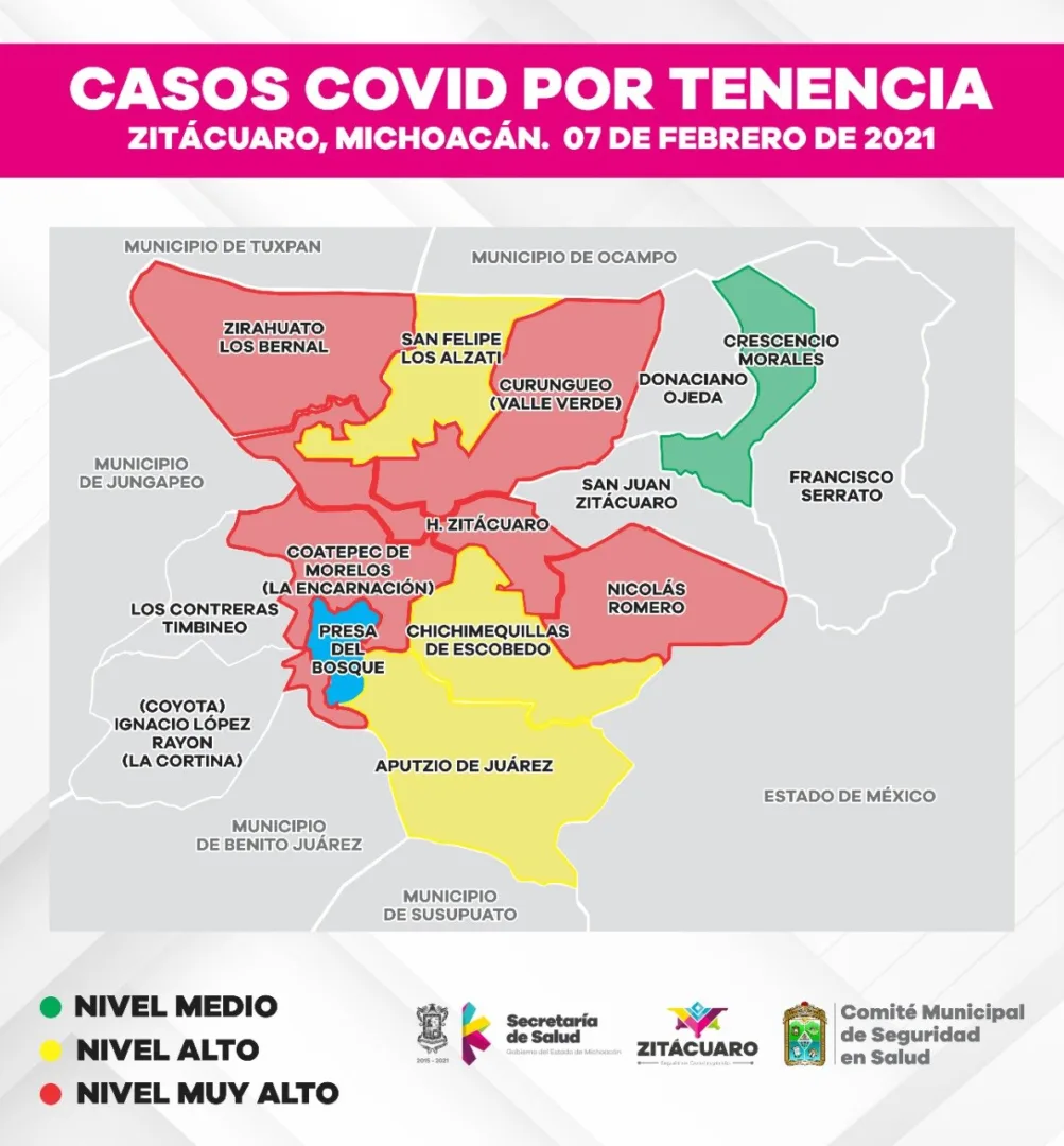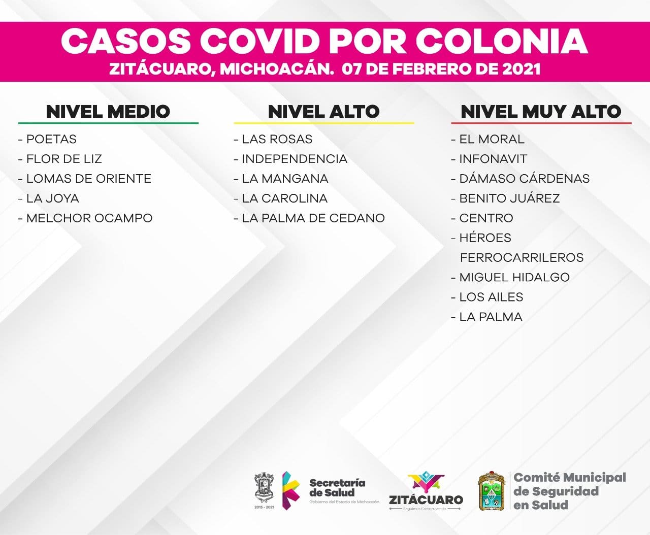 Zitácuaro registra al corte 1, 420 infectados y 138 muertes por COVID-19, derivado de ello el Comité municipal de Seguridad en Salud, continúa compartiendo las principales colonias y comunidades donde se ubica el mayor riesgo de contagio con base en el número de personas infectadas.