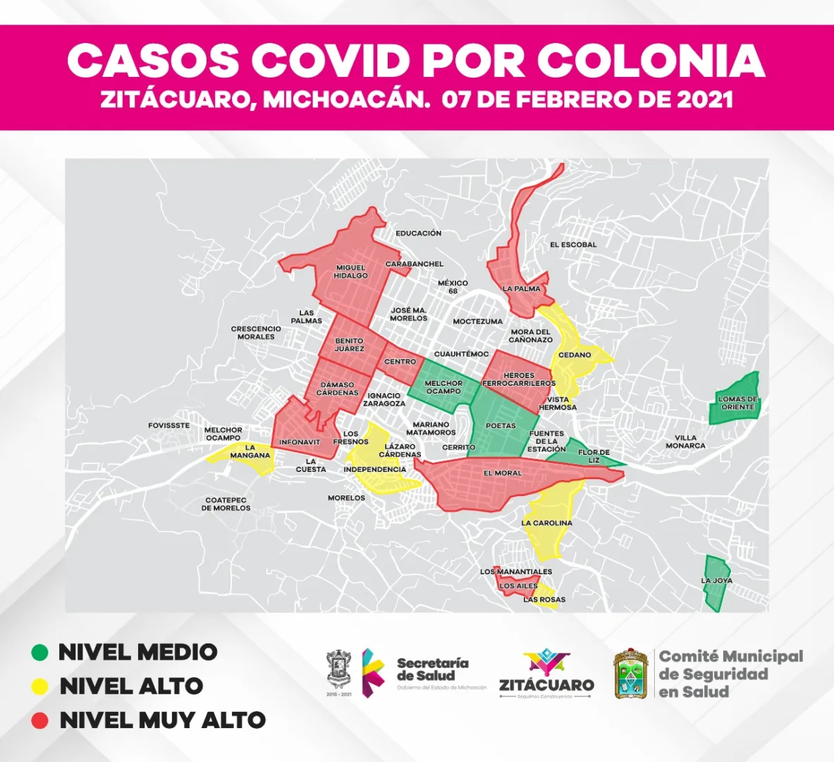 Zitácuaro registra al corte 1, 420 infectados y 138 muertes por COVID-19, derivado de ello el Comité municipal de Seguridad en Salud, continúa compartiendo las principales colonias y comunidades donde se ubica el mayor riesgo de contagio con base en el número de personas infectadas.
