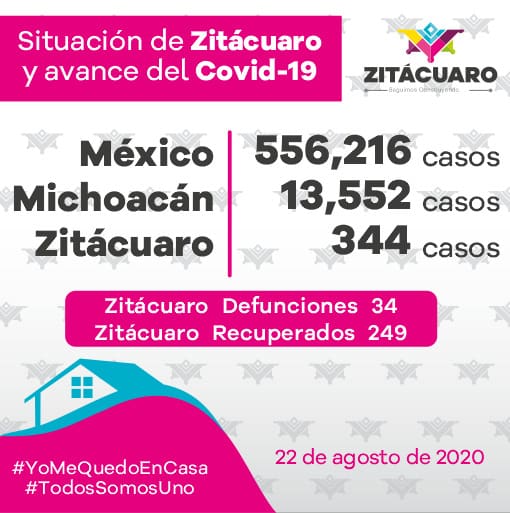 El gobierno municipal de Zitácuaro que encabeza el alcalde Hugo Alberto Hernández Suárez informa la situación de covid-19 en Zitácuaro, de acuerdo al reporte diario emitido por el Comité Estatal de Seguridad en Salud y a la información pública, que se encuentra disponible en https://michoacancoronavirus.com/nuevaconvivencia/ con corte al 22 de agosto de 2020: