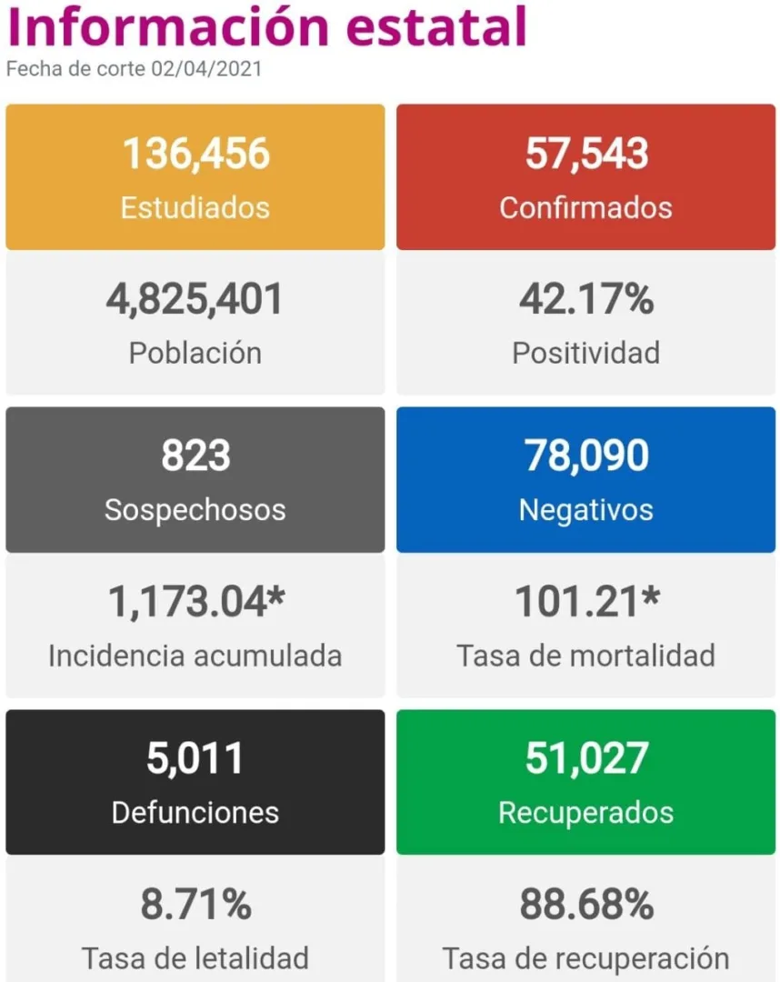 El Comité Estatal de Seguridad en Salud, en https://michoacancoronavirus.com/nuevaconvivencia/ con corte al 2 de Abril de 2021, reporta: