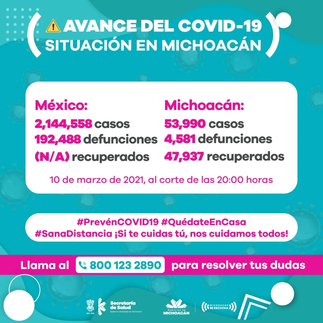 El Comité Estatal de Seguridad en Salud, en https://michoacancoronavirus.com/nuevaconvivencia/ con corte al 10 de marzo de 2021, reporta: