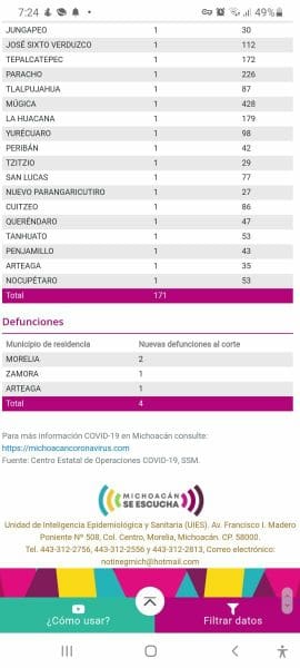 El Gobierno municipal de Zitácuaro que preside el alcalde Hugo Alberto Hernández Suárez, informa la situación de covid-19 en Zitácuaro, de acuerdo al reporte diario emitido por el Comité Estatal de Seguridad en Salud, mismo que se encuentra disponible en https://michoacancoronavirus.com/nuevaconvivencia/ con corte al 29 de noviembre de 2020: