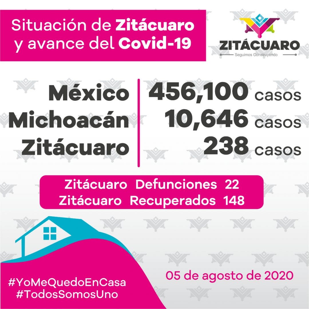 El gobierno municipal de Zitácuaro que encabeza el alcalde Hugo Alberto Hernández Suárez informa la situación de covid-19 en Zitácuaro, de acuerdo al reporte diario emitido por el Comité Estatal de Seguridad en Salud y a la información pública, que se encuentra disponible en https://michoacancoronavirus.com/nuevaconvivencia/ con corte al 5 de agosto de 2020:
