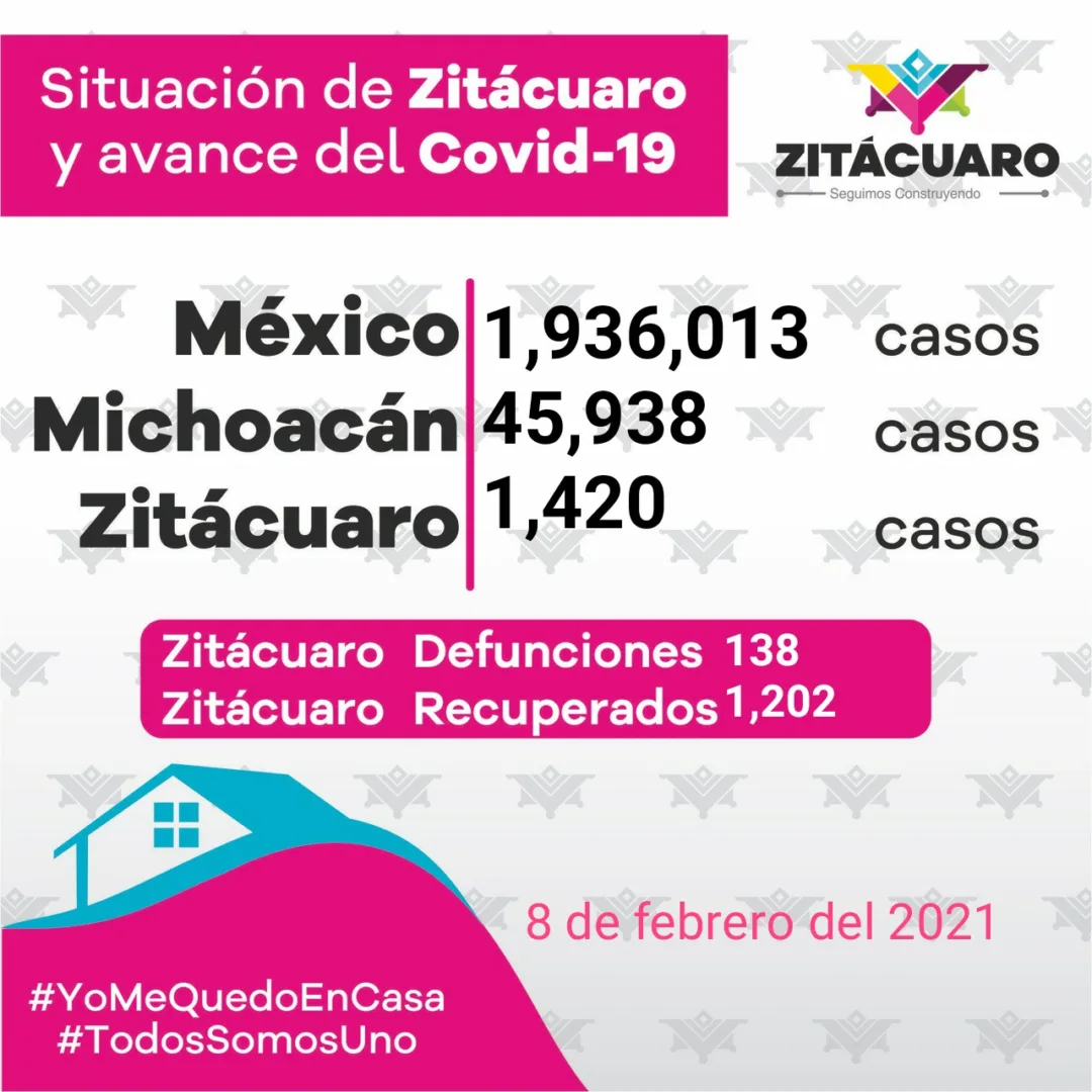 Seguimos en alerta en Zitácuaro. Hoy el Comité Estatal de Seguridad en Salud, en https://michoacancoronavirus.com/nuevaconvivencia/ con corte al 8 de febrero de 2021, reporta: