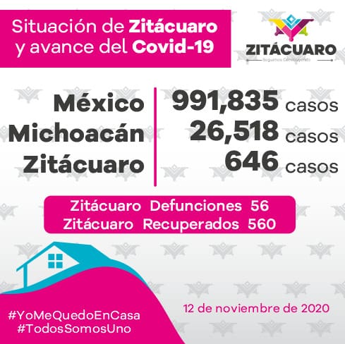 El Gobierno municipal de Zitácuaro que preside el alcalde Hugo Alberto Hernández Suárez, informa la situación de covid-19 en Zitácuaro, de acuerdo al reporte diario emitido por el Comité Estatal de Seguridad en Salud, mismo que se encuentra disponible en https://michoacancoronavirus.com/nuevaconvivencia/ con corte al 12 de noviembre de 2020: