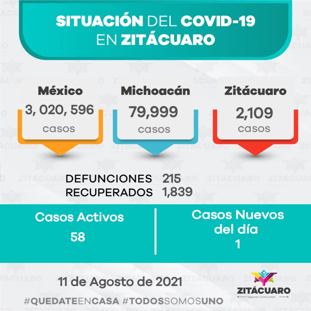 Zitácuaro reporta hoy 58 casos activos por COVID-19, hasta el momento Zitácuaro acumula 215 defunciones asociadas al coronavirus .