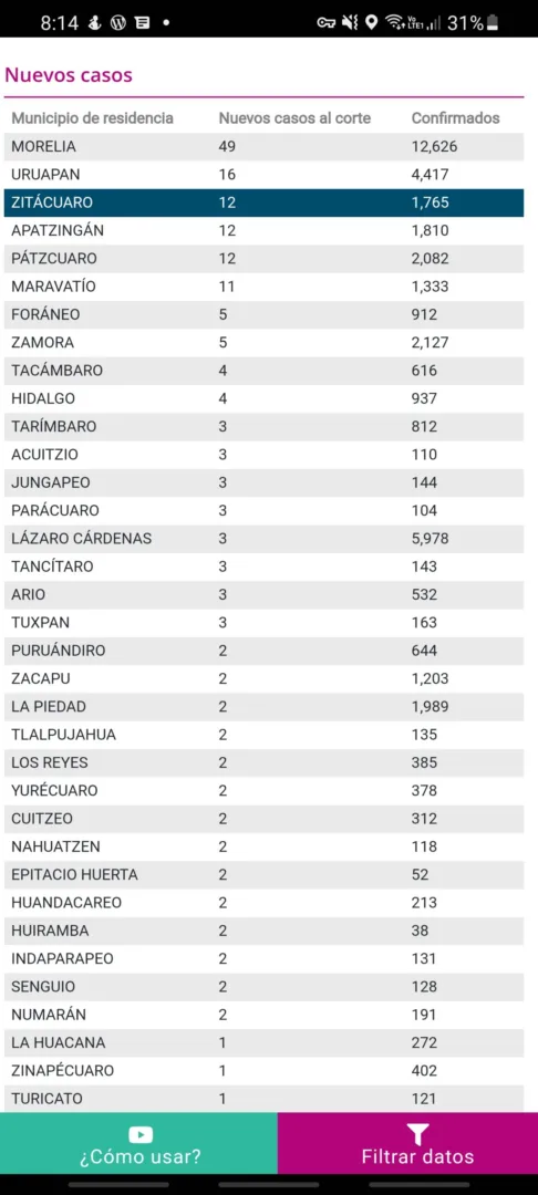 El Comité Estatal de Seguridad en Salud, en https://michoacancoronavirus.com/nuevaconvivencia/ con corte al 15 de marzo de 2021, reporta: