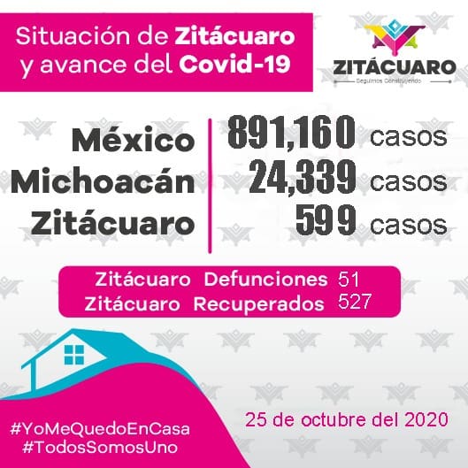 El Gobierno municipal de Zitácuaro que encabeza el alcalde Hugo Alberto Hernández Suárez, informa la situación de covid-19 en Zitácuaro, de acuerdo al reporte diario emitido por el Comité Estatal de Seguridad en Salud y a la información pública, que se encuentra disponible en https://michoacancoronavirus.com/nuevaconvivencia/ con corte al 24 de octubre de 2020: