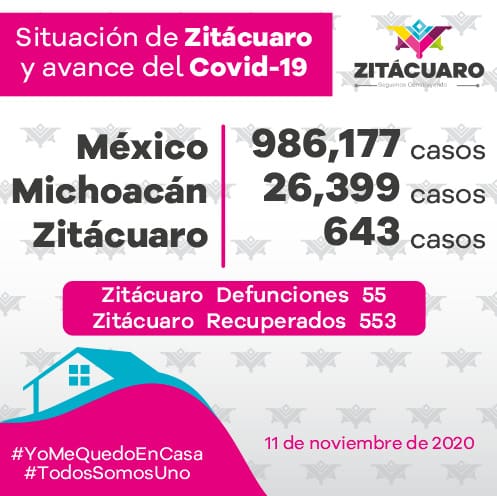 El Gobierno municipal de Zitácuaro que preside el alcalde Hugo Alberto Hernández Suárez, informa la situación de covid-19 en Zitácuaro, de acuerdo al reporte diario emitido por el Comité Estatal de Seguridad en Salud, mismo que se encuentra disponible en https://michoacancoronavirus.com/nuevaconvivencia/ con corte al 11 de noviembre de 2020: