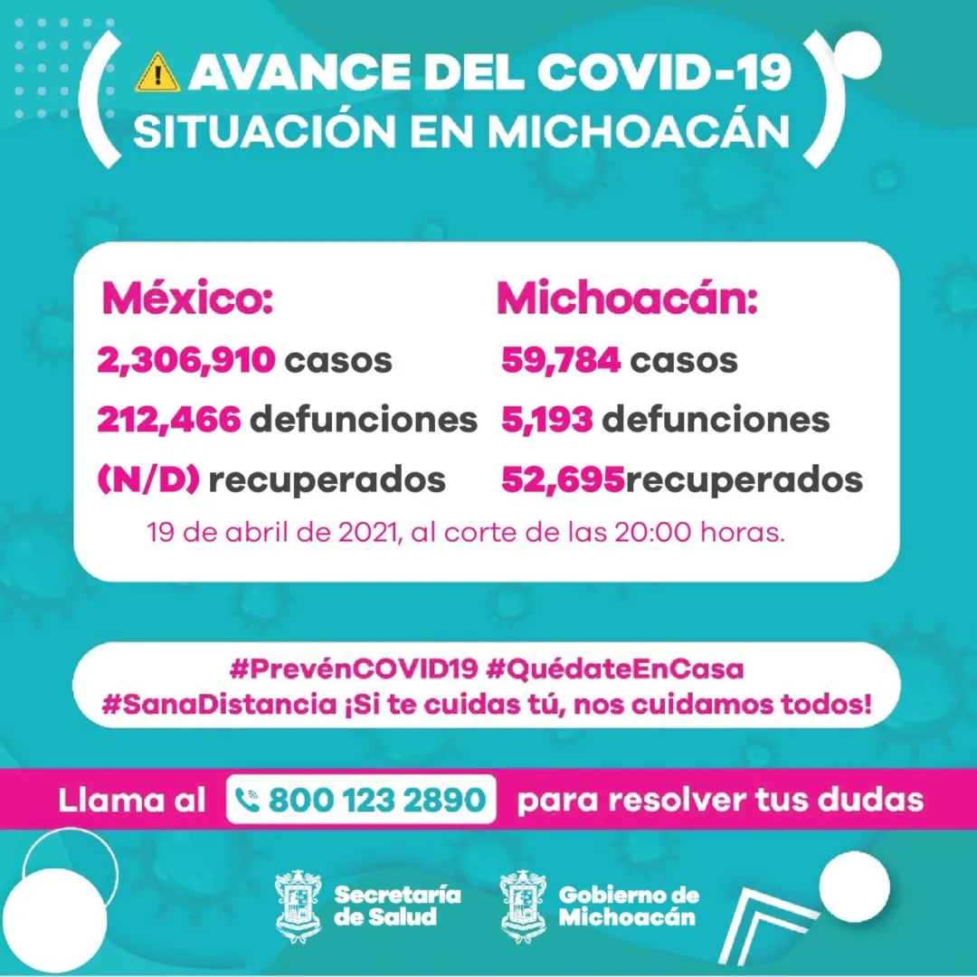 El Comité Estatal de Seguridad en Salud, en https://michoacancoronavirus.com/nuevaconvivencia/ con corte al 19 de Abril de 2021, reporta:
