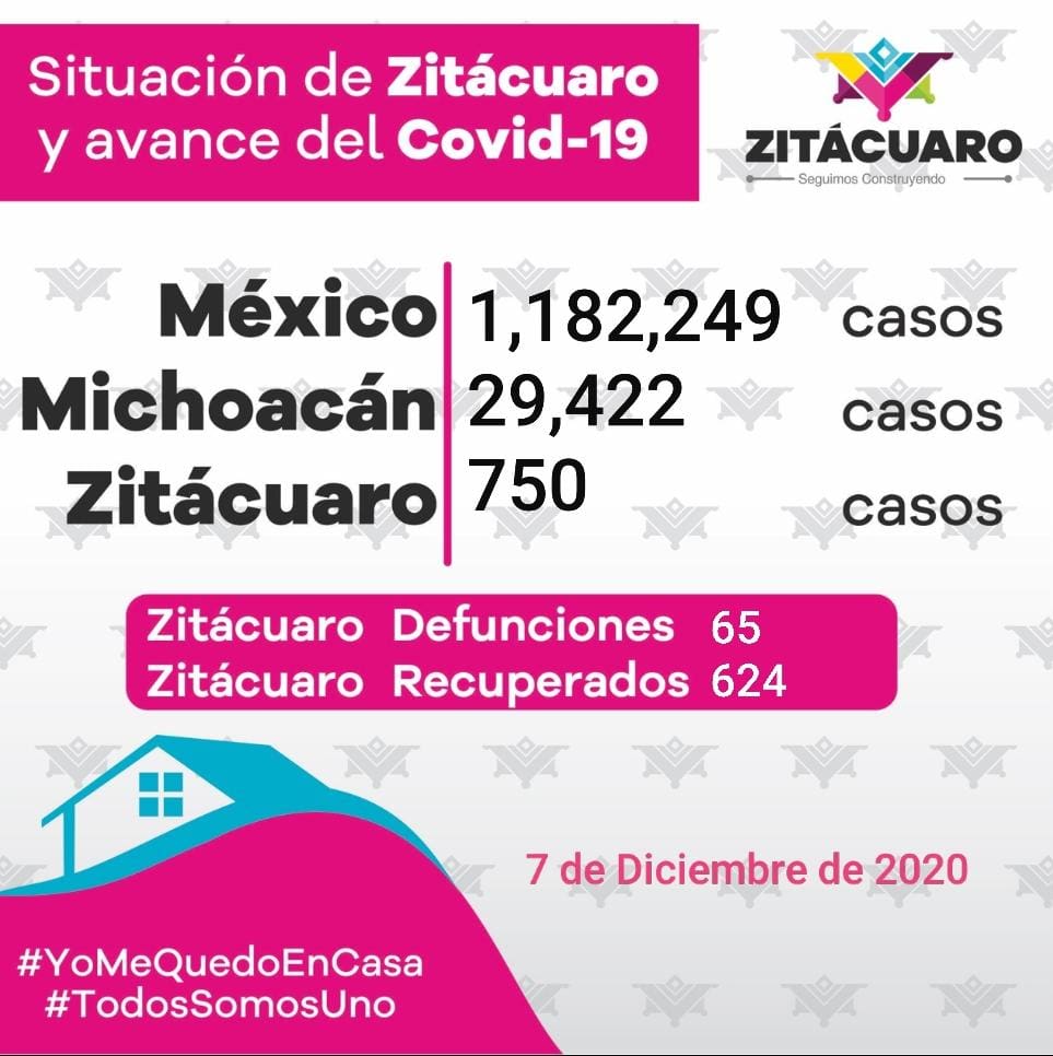 El Gobierno municipal de Zitácuaro que preside el alcalde Hugo Alberto Hernández Suárez, informa la situación de covid-19 en Zitácuaro, de acuerdo al reporte diario emitido por el Comité Estatal de Seguridad en Salud, mismo que se encuentra disponible en https://michoacancoronavirus.com/nuevaconvivencia/ con corte al 07 de diciembre de 2020: