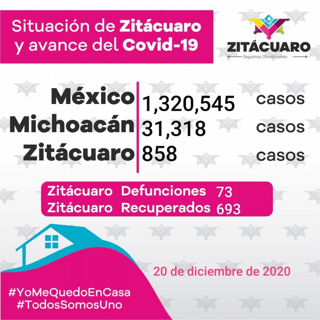 Gobierno municipal de Zitácuaro que preside el alcalde Hugo Alberto Hernández Suárez, informa la situación de covid-19 en Zitácuaro, de acuerdo al reporte diario emitido por el Comité Estatal de Seguridad en Salud, mismo que se encuentra disponible en https://michoacancoronavirus.com/nuevaconvivencia/ con corte al 20 de diciembre de 2020: