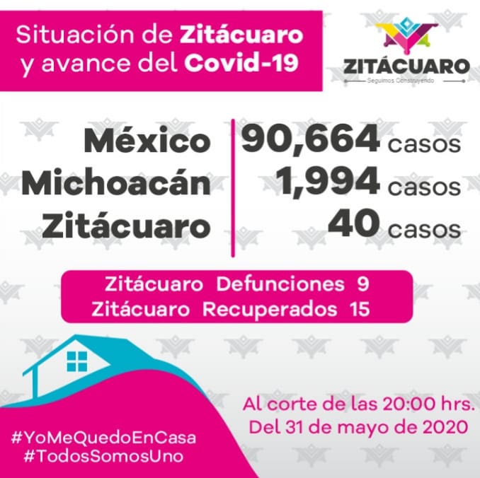 De acuerdo al reporte diario emitido por el Comité Estatal de Seguridad en Salud, en relación a la emergencia sanitaria por COVID-19 en la entidad y el municipio, el Gobierno municipal de Zitácuaro informa que, al corte de hoy, domingo 31 de mayo del 2020 a las 20:00 hrs. se registran: