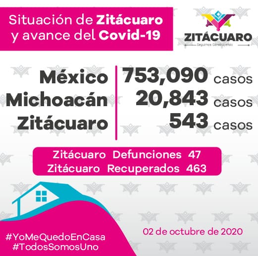 El Gobierno municipal de Zitácuaro que encabeza el alcalde Hugo Alberto Hernández Suárez, informa la situación de covid-19 en Zitácuaro, de acuerdo al reporte diario emitido por el Comité Estatal de Seguridad en Salud y a la información pública, que se encuentra disponible en https://michoacancoronavirus.com/nuevaconvivencia/ con corte al 2 de octubre de 2020: