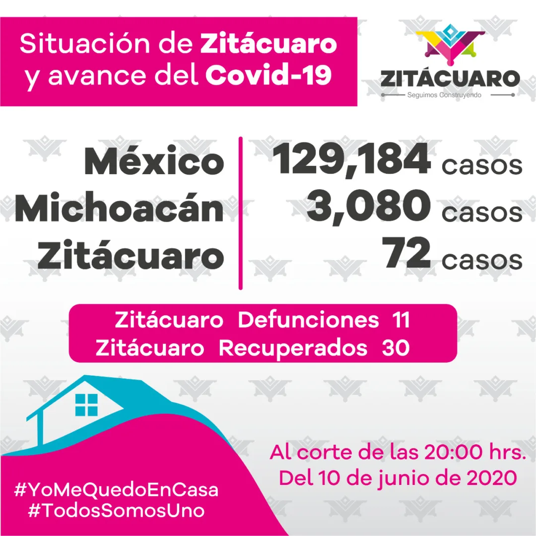 De acuerdo al comunicado diario emitido por el Comité Estatal de Seguridad en Salud y a la información publicada en https://michoacancoronavirus.com/nuevaconvivencia/ en Zitácuaro y el estado, con corte al 10 de junio, de 2020, a las 20:00 hrs. se reportan: