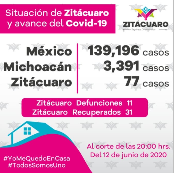 De acuerdo al comunicado diario emitido por el Comité Estatal de Seguridad en Salud y a la información publicada en https://michoacancoronavirus.com/nuevaconvivencia/ en Zitácuaro y el estado, con corte al 12 de junio, de 2020, a las 20:00 hrs. se reportan: