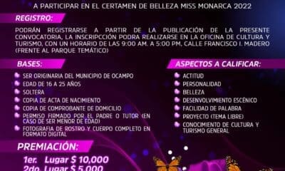 Ocampo, Mich.- El H. Ayuntamiento de Ocampo invita a las señoritas del municipio a participar en el Certamen de Belleza “Miss Monarca 2022”.