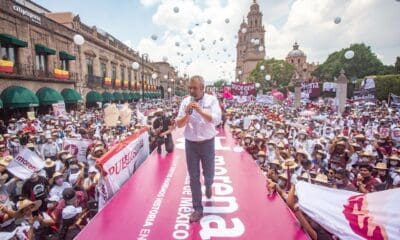 Pie de foto: Más de 40 mil personas de todo Michoacán se reunieron al cierre estatal del candidato de Morena-PT, Alfredo Ramírez Bedolla, quien estuvo acompañado...