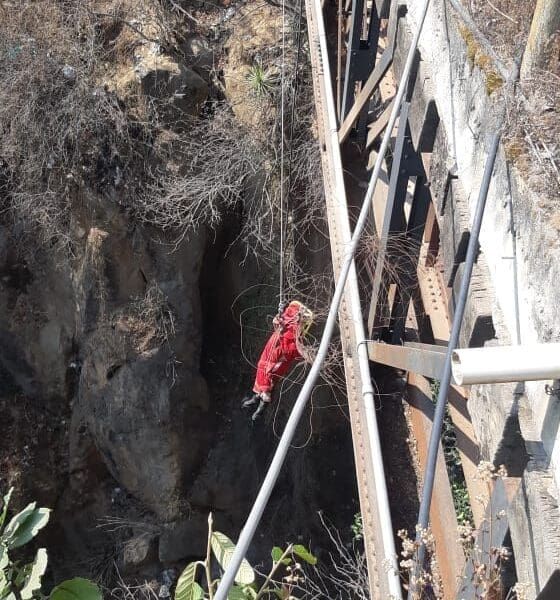 Recuperando el cuerpo de una persona que al parecer, se arrojó al fondo del puente de fierro en Zitácuaro