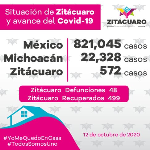 Zitácuaro reporta 4 casos nuevos por COVID19, suma 572 casos confirmados.