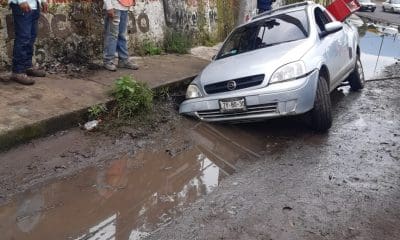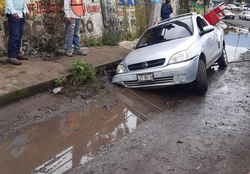 Conductor sufre percance vehicular al caer a una coladera en la Avenida Revolución Sur