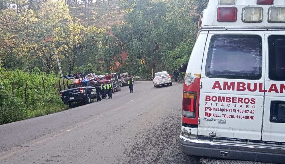 itácuaro, Michoacán. -Bomberos Zitácuaro reportó sobre una volcadura vehicular en la carretera Federal Zitácuaro-Morelia a la altura de las curvas del gato, no hay personas lesionadas.