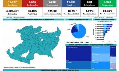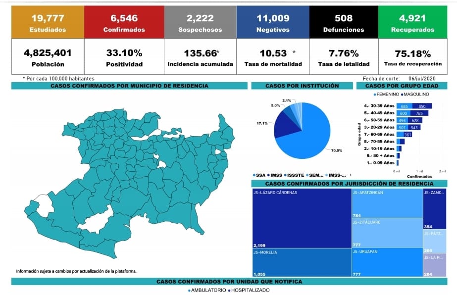 *- Michoacán registró en las últimas 24 horas 11 muertos y 93 casos nuevos por COVID-19, suman 508 defunciones y 6546 casos acumulados.
