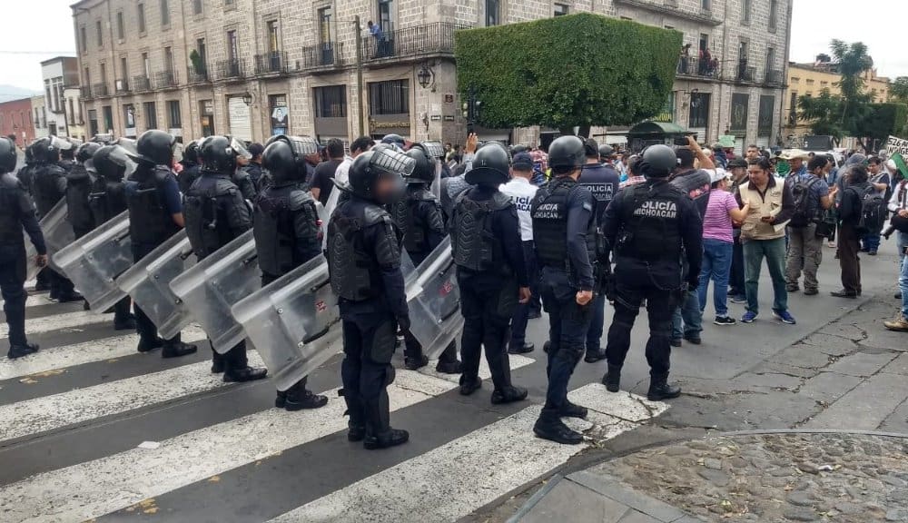 Morelia, Michoacán.- La Secretaría de Seguridad Pública (SSP), mantiene el despliegue policial en la zona Centro de Morelia, tras la manifestación de integrantes del Frente Nacional...