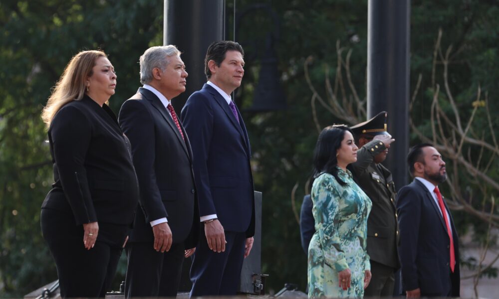 Las banderas de México, Michoacán y Morelia fueron izadas en la Plaza Jardín Morelos.