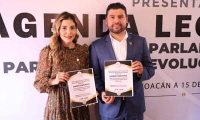 Morelia, Michoacán, 15 de noviembre de 2024.- Los diputados Brissa Arroyo y Octavio Ocampo Córdova, del Grupo Parlamentario del Partido de la Revolución Democrática (GPPRD) en...