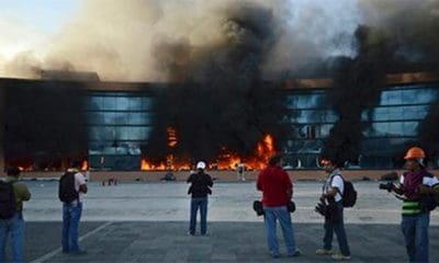 Estudiantes de la Normal Rural de Ayotzinapa que protestan en la capital de Guerrero, Chilpancingo, contra la desaparición de 43 de sus compañeros han atacado la...