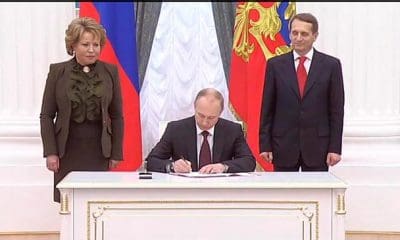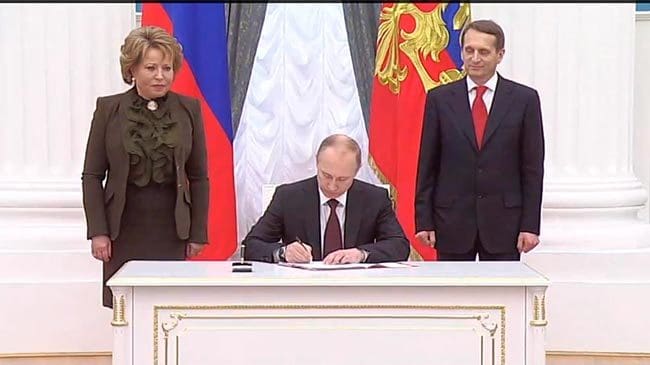El presidente de Rusia, Vladímir Putin, firma la ley sobre la reunificación de la República de Crimea y de la ciudad de Sebastopol con la Federación...
