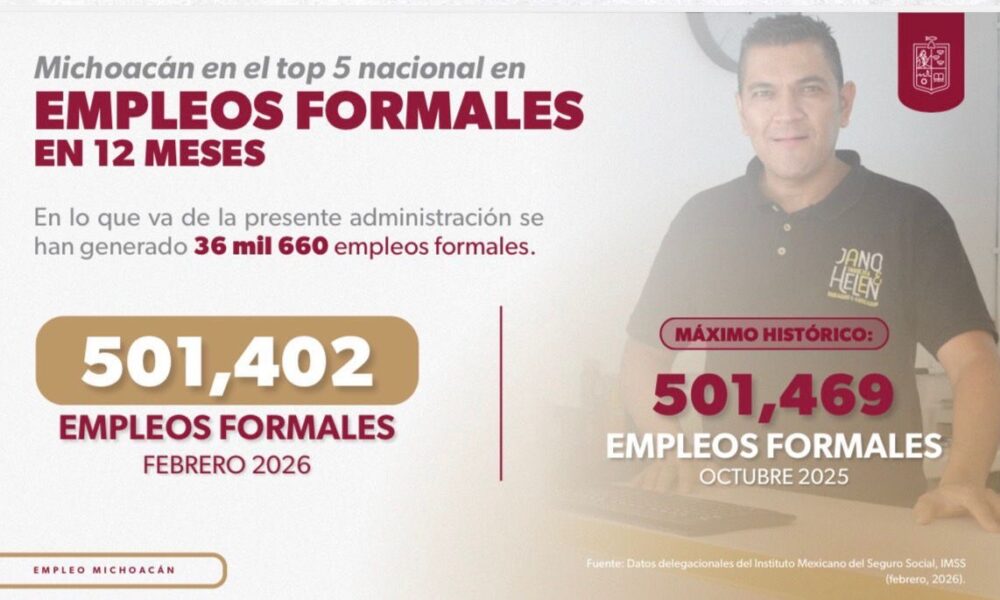 Morelia, Michoacán, 16 de marzo de 2026. Michoacán registró un total de 501 mil 402 trabajadores asegurados ante el Instituto Mexicano del Seguro Social (IMSS) al...