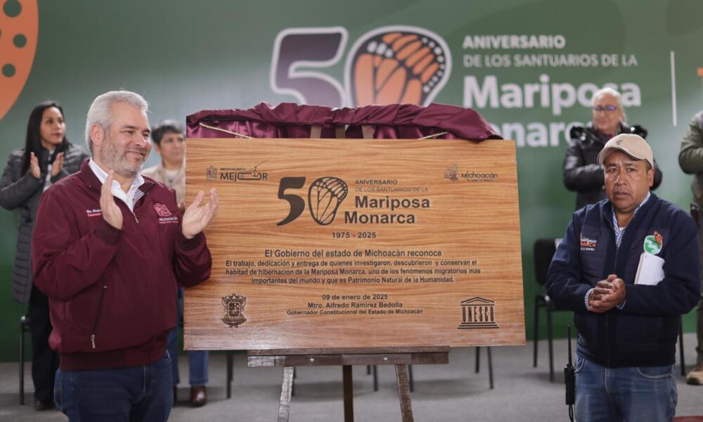 Angangueo, Michoacán, 9 de enero de 2025. En la conmemoración del 50 aniversario del descubrimiento de los Santuarios de la Mariposa Monarca, el gobernador Alfredo Ramírez...