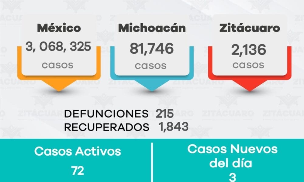 Zitácuaro reporta 3 casos nuevos por COVID-19 hay 72 casos activos y 18 casos sospechosos.