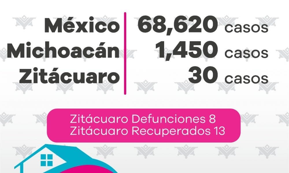 México 68,620Michoacán 1450Zitácuaro 30Defunciones Zitácuaro 8Recuperados Zitácuaro 13Sospechosos Jurisdicción 03: 40Sospechosos Zitácuaro: 14