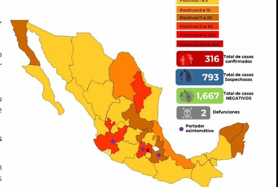 En México hasta el día de hoy se han confirmado 316 casos y dos defunciones porCOVID-19 en Durango y Cuidad de México.