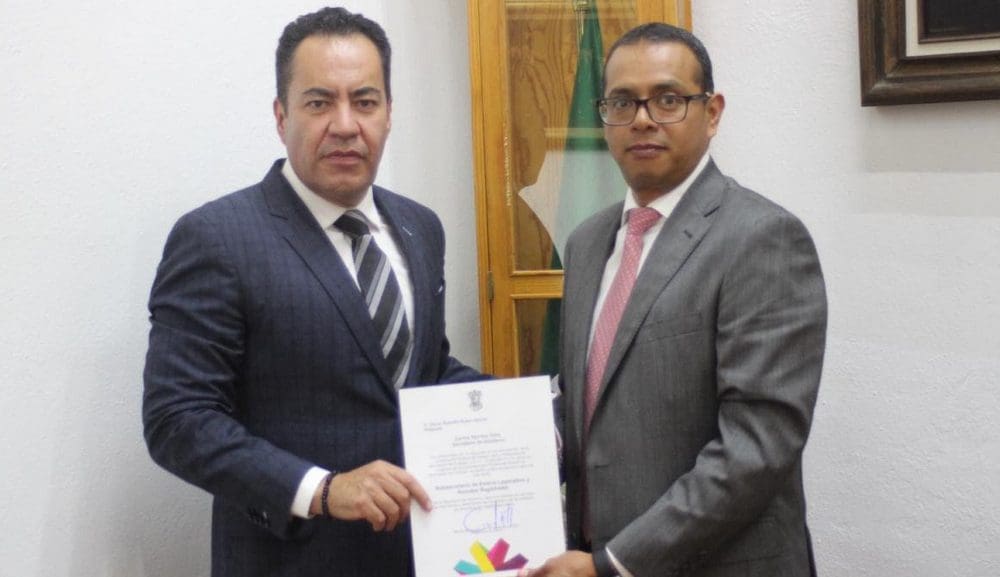 Morelia, Michoacán.- El secretario de Gobierno, Carlos Herrera Tello entregó el nombramiento como nuevo subsecretario de Enlace Legislativo y Asuntos Regístrales a Oscar Rodolfo Rubio García.