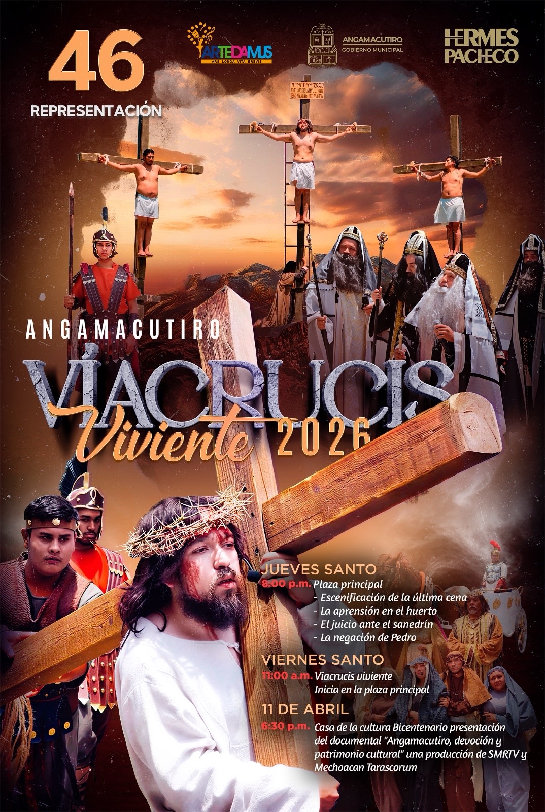 La programación oficial para este año iniciará el Jueves Santo a las 20:00 horas en la plaza principal, donde se representarán pasajes como la Última Cena y el juicio ante el Sanedrín. El Viernes Santo, la actividad comenzará a las 11:00 horas con el recorrido del Viacrucis hacia el calvario. Las autoridades municipales informaron que el Sistema Michoacano de Radio y Televisión (SMRTV) presentará próximamente un documental sobre esta tradición, la cual cuenta ya con dos registros monográficos.