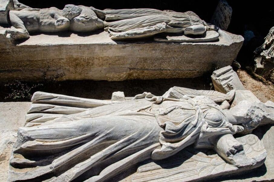 A lo largo de varias décadas de excavación arqueológica se han encontrado unos 200 objetos de mármol de gran tamaño, lo que, en opinión de los expertos, pone de manifiesto la gran fastuosidad del recinto. Entre las piezas más destacadas figuran un estatua de Nike, la diosa de la victoria, sostenida por el dios Atlas, así como una efigie de Isis, una deidad egipcia representada como Tyche, la diosa de la fortuna de la ciudad.